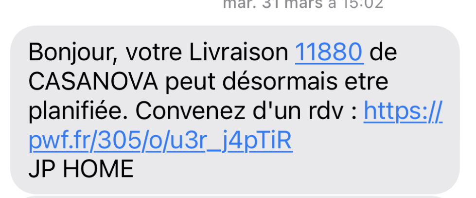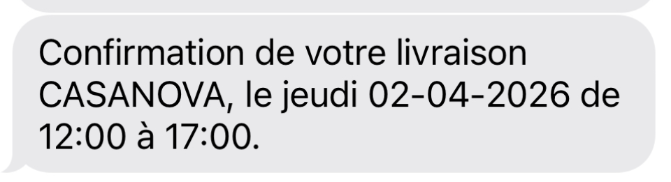 Dès réception de votre commande dans l'agence de livraison, notre transporteur JP HOME vous envoie un SMS avec un lien pour choisir votre créneau de livraison. À noter : la livraison en horaire matinal (7h00 - 8h30) est disponible moyennant un supplément de 19€, facturé directement par JP HOME.