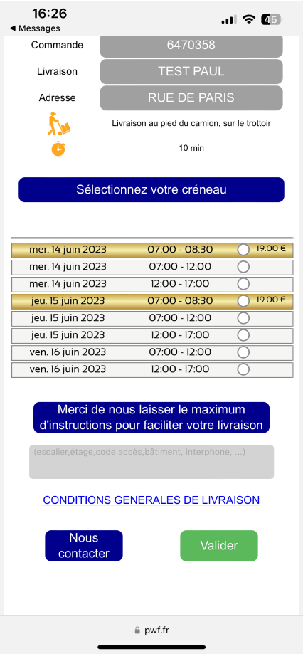 Choisissez le créneau qui vous convient le mieux pour recevoir votre commande en toute tranquillité. La plage horaire de livraison est de 5h, puis réduite à 2h la veille de la livraison.